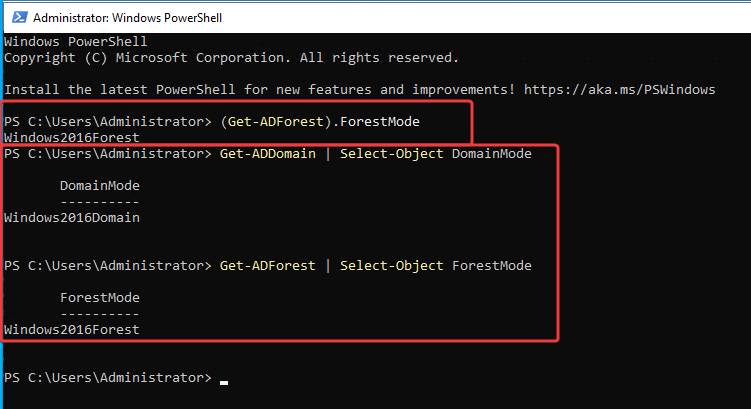 Forest düzeyi Windows Server 2016’nın altındaysa ve tüm DC’ler 2016 veya üzeri çalışıyorsa, aşağıdaki komutla yükseltebilirsiniz: