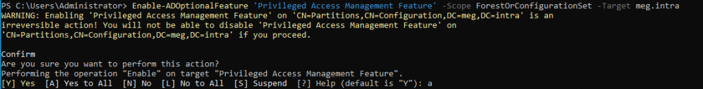 Enable-ADOptionalFeature 'Privileged Access Management Feature' `