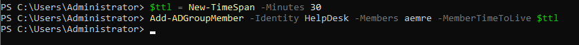 $ttl = New-TimeSpan -Minutes 30# Kullanıcıyı gruba geçici olarak ekle