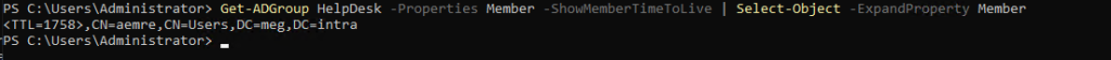 Get-ADGroup ‘HelpDesk’ -Properties Member -ShowMemberTimeToLive | Select-Object -ExpandProperty Member