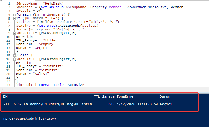 Get-ADGroup 'HelpDesk' -Properties Member -ShowMemberTimeToLive# Çıktı örneği: