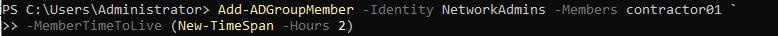 $ttl = New-TimeSpan -Minutes 30# Kullanıcıyı gruba geçici olarak ekle