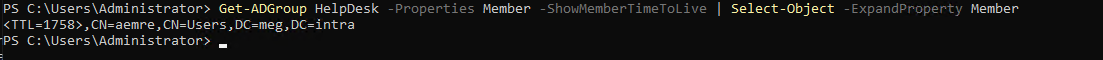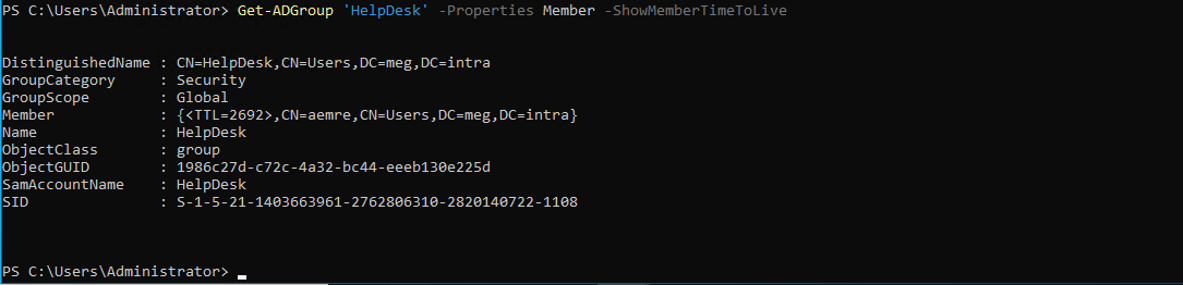 Get-ADGroup 'HelpDesk' -Properties Member -ShowMemberTimeToLive# Çıktı örneği: