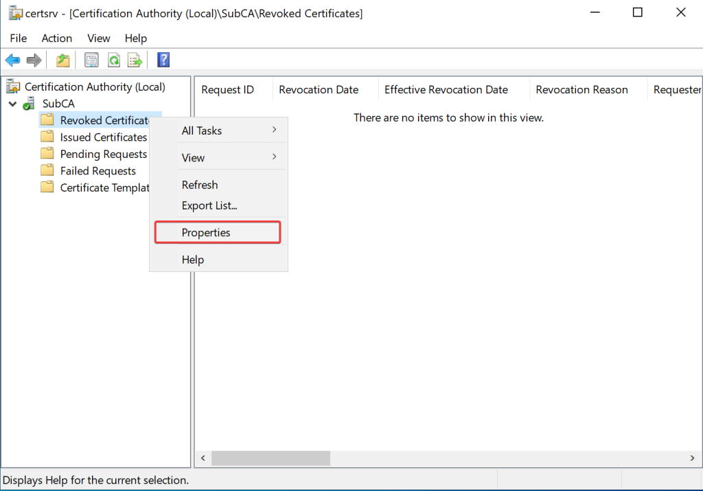 # certsrv.msc → CA adına sağ tık → Properties