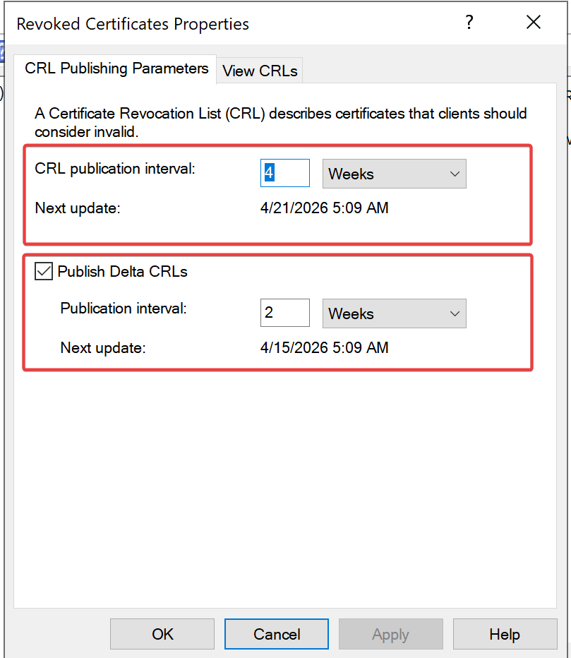 certutil -setreg CA\CRLPeriod “Weeks”
