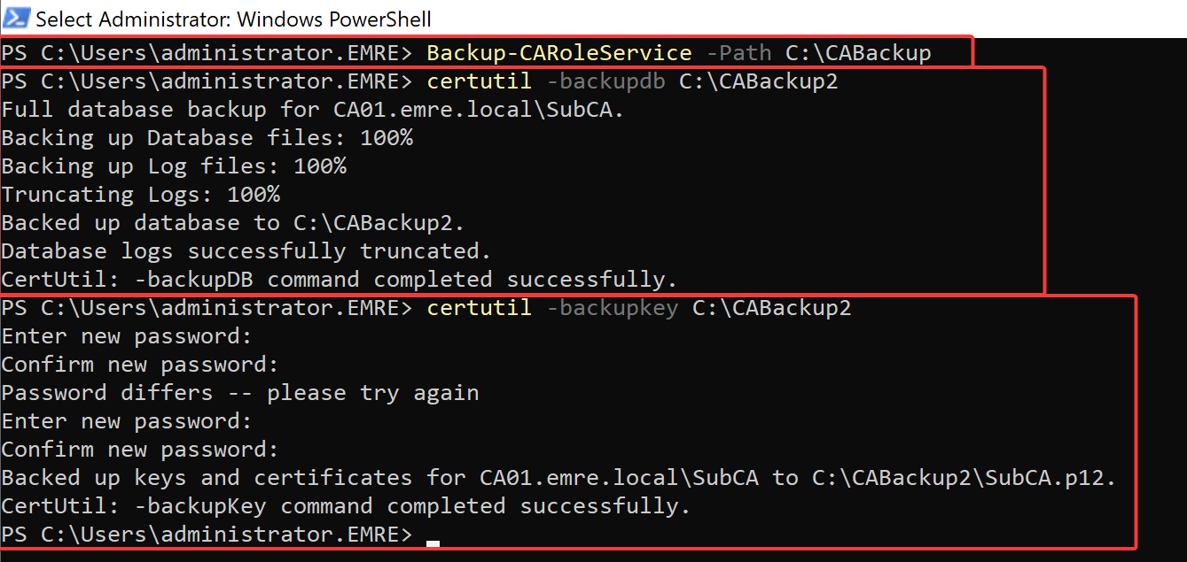 Backup-CARoleService -Path “C:\CABackup”
