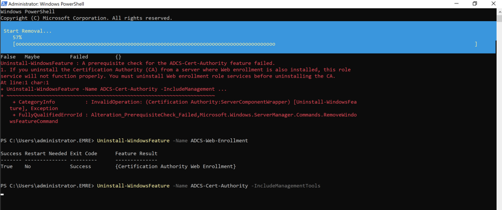 Eğer ortamınızda Web Enrollment Role Servisi yüklü ise yukarıdaki Uninstall-WindowsFeature komutunda hata alacaksınız. Öncelikle Web-Enrollment Role Servisi kaldırmanız gerekmektedir.