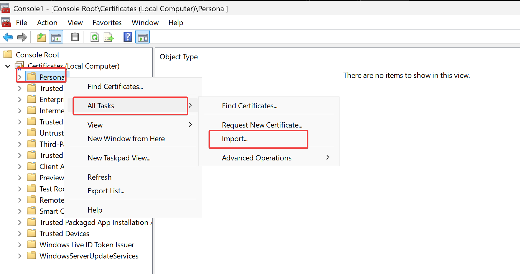 # “Place all certificates in the following store: Personal”