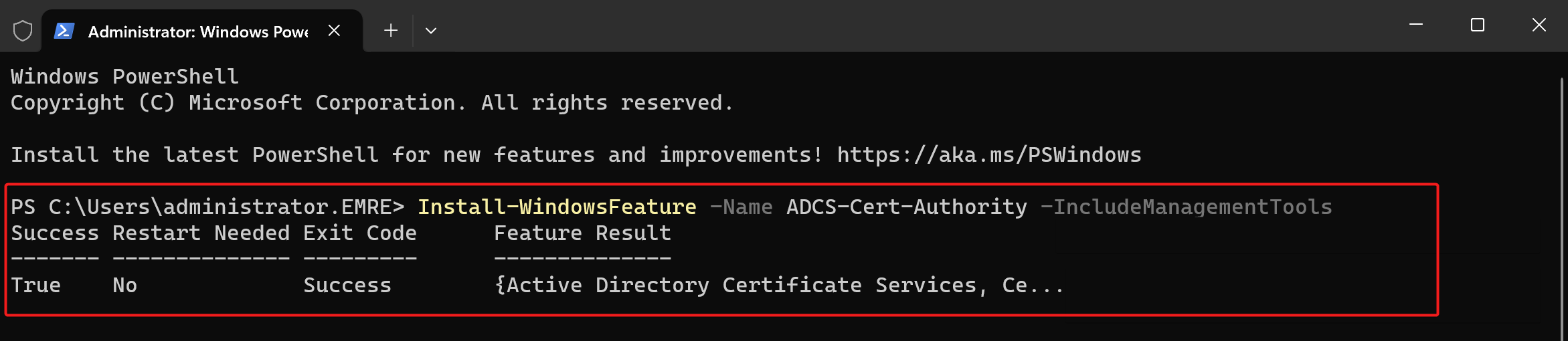 Install-WindowsFeature -Name ADCS-Cert-Authority -IncludeManagementTools