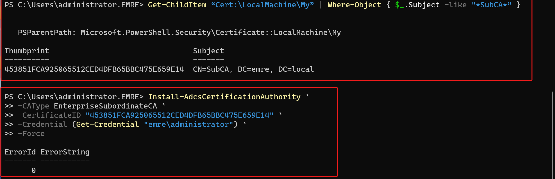 Get-ChildItem “Cert:\LocalMachine\My” | Where-Object { $_.Subject -like “*CORP-SubCA*” }