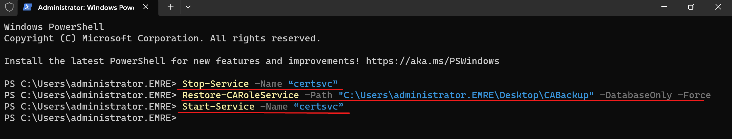 Restore-CARoleService -Path “C:\CARestore” -DatabaseOnly -Force
