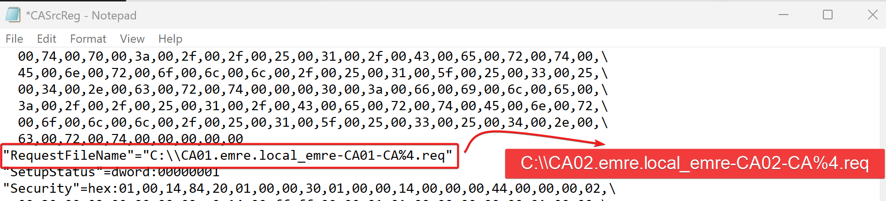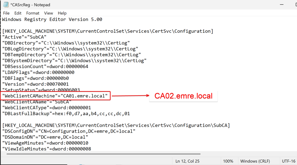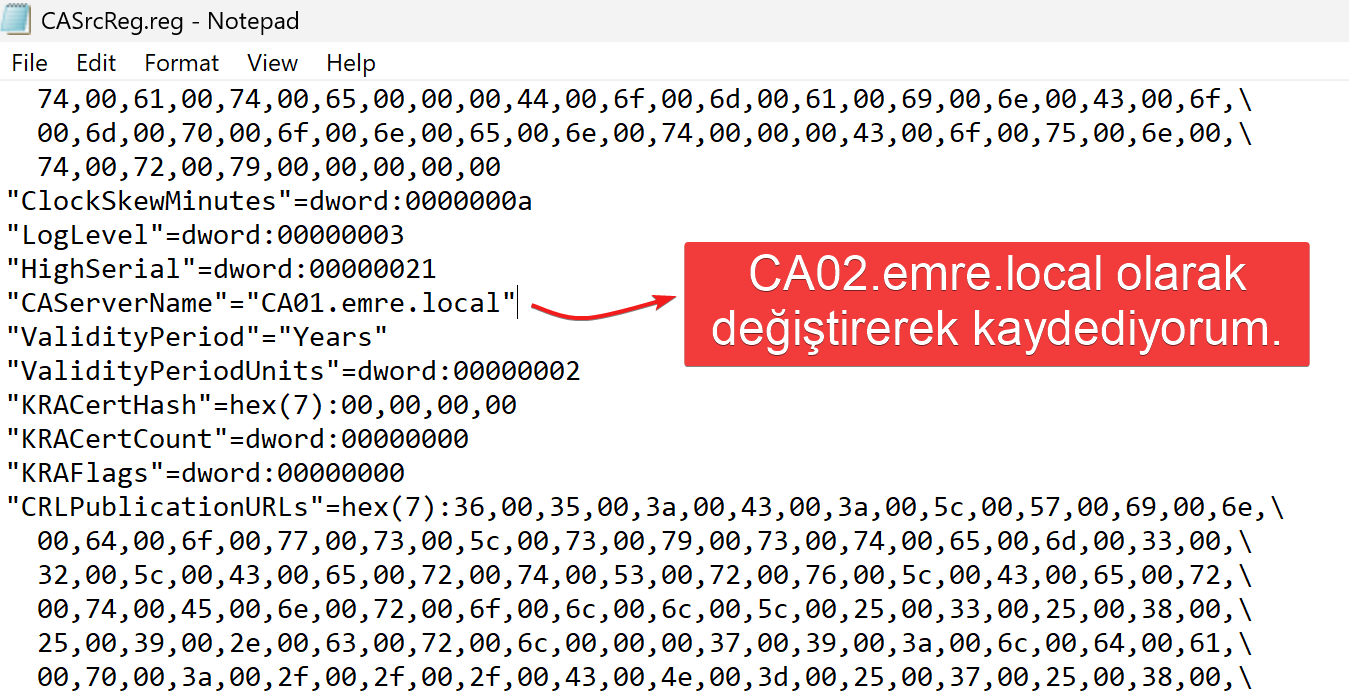 CA yapılandırma bilgileri HKLM\SYSTEM\CurrentControlSet\Services\CertSvc\Configuration altında tutulur. Kaynak CA registry dosyası doğrudan import edilmemelidir; önce metin editörüyle incelenip gerekliyse düzenlenmelidir.