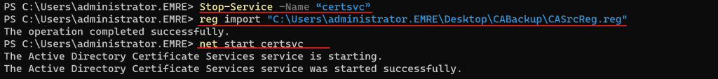 Servisi durdur, registry’yi import et: net stop certsvc ardından reg import CASrcReg.reg