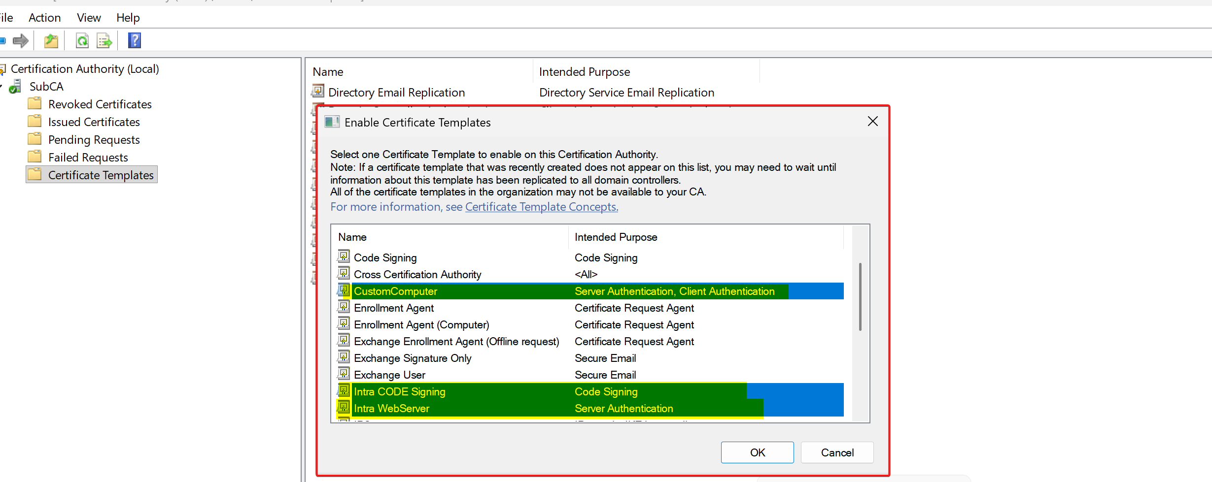 # Enterprise CA için şablon listesini kaydet
