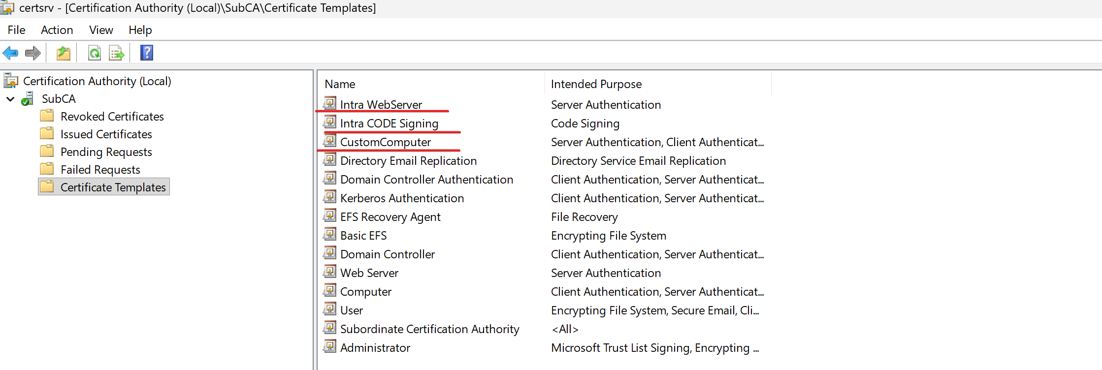 Benim ortamımda herhangi bir CAPolicy.inf dosyası bulunmamakta. Template olarak default dışı 3 sertifika olduğu görülmekte. Migrate sonrası bu sertifikaları yeni sunucumuzda da issue edebilmemiz gerekiyor.