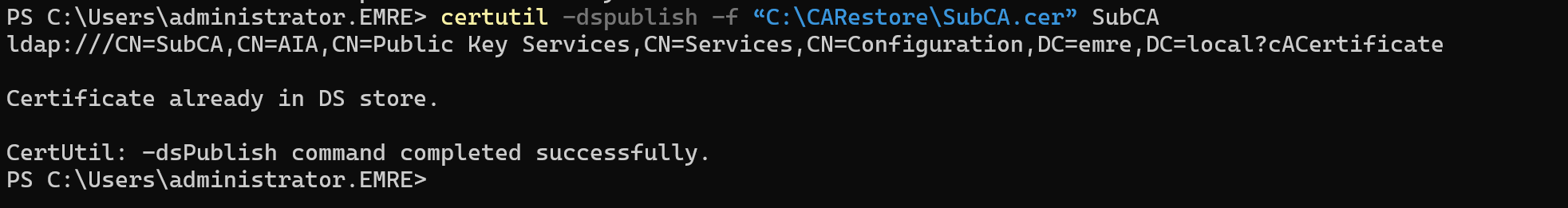 certutil -dspublish -f “C:\CARestore\CORP-SubCA.cer” SubCA