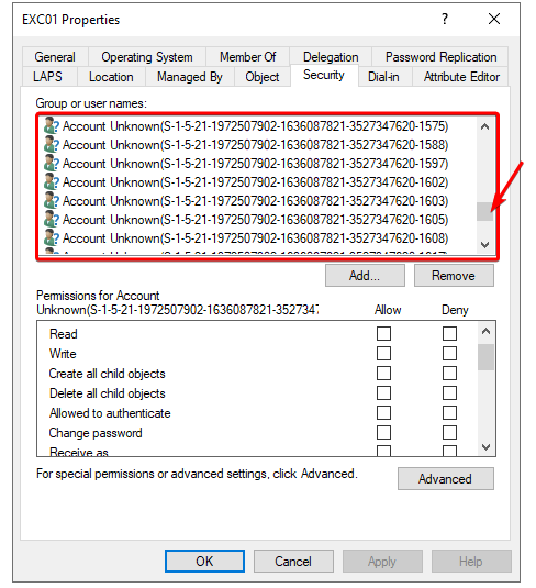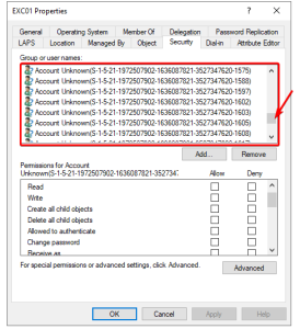 Peki bende neden böyle bir hata verdi dersiniz? Demezsiniz artık, sebebini yukarıda zaten bahsettik. Ama senaryoyu merak eden arkadaşlar için belirteyim. Exchange kurulumunda sürekli olarak hata aldığımdan dolayı, AD üzerinde exchange obje temizliği yaptım. Fakat exchange$ bilgisayar hesabını hiç silmedim. PrepareAD komutlarında ilgili groupları sunucu üzerinde yetkilendirdiğinden, ve ben her hatada bu grupları ve Exchange AD Objelerini kaldırdığımdan taktir edersiniz ki bilgisayar hesabı üzerinde çok fazla Unknown Account bulunmaktaydı. Sayısının ekran görüntüsünü bulamadım fakat 1268 gibi bir rakamdı. Bunları temizledikten sonra hata çözümlendi.