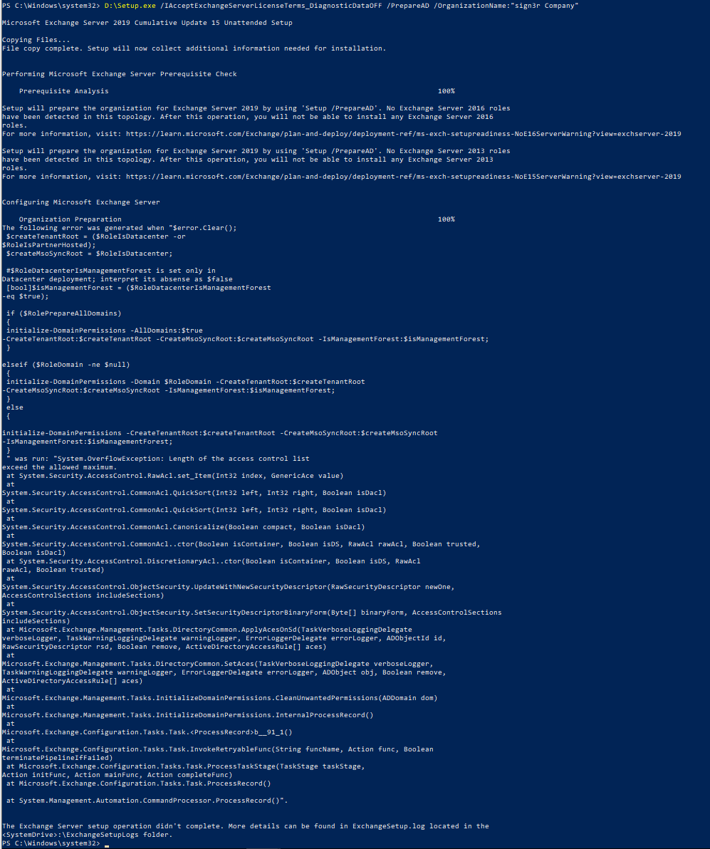 Exchange kurulumlarında karşılaşabileceğiniz “System.OverflowException: Length of the access control list