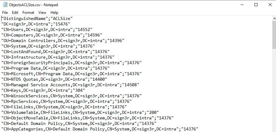 Import-Module ActiveDirectory $objects = Get-ADObject -Filter * $ReportPath = "c:\test\ObjectsACLSize.csv" $result = @() foreach ($obj in $objects) { $dn = $obj.DistinguishedName $adsi = [ADSI]("LDAP://$dn") try{ $sdBytes = $adsi.psbase.ObjectSecurity.GetSecurityDescriptorBinaryForm() $rawSD = New-Object System.Security.AccessControl.RawSecurityDescriptor($sdBytes, 0) $rawBytes = New-Object byte[] $rawSD.BinaryLength $rawSD.GetBinaryForm($rawBytes, 0) $reportobj = [PsCustomObject]@{ DistinguishedName = $dn ACLSize = $rawBytes.Length } $result += $reportobj } catch { Write-Host -ForegroundColor Red "$dn Objesinde hata alındı." $reportobj = [PsCustomObject]@{ DistinguishedName = $dn ACLSize = "ERROR : $($Error[0].Exception.Message)" } $result += $reportobj } } $result | Export-Csv -Path $ReportPath -Encoding UTF8 -Delimiter ";" -NoTypeInformation Write-Output $result