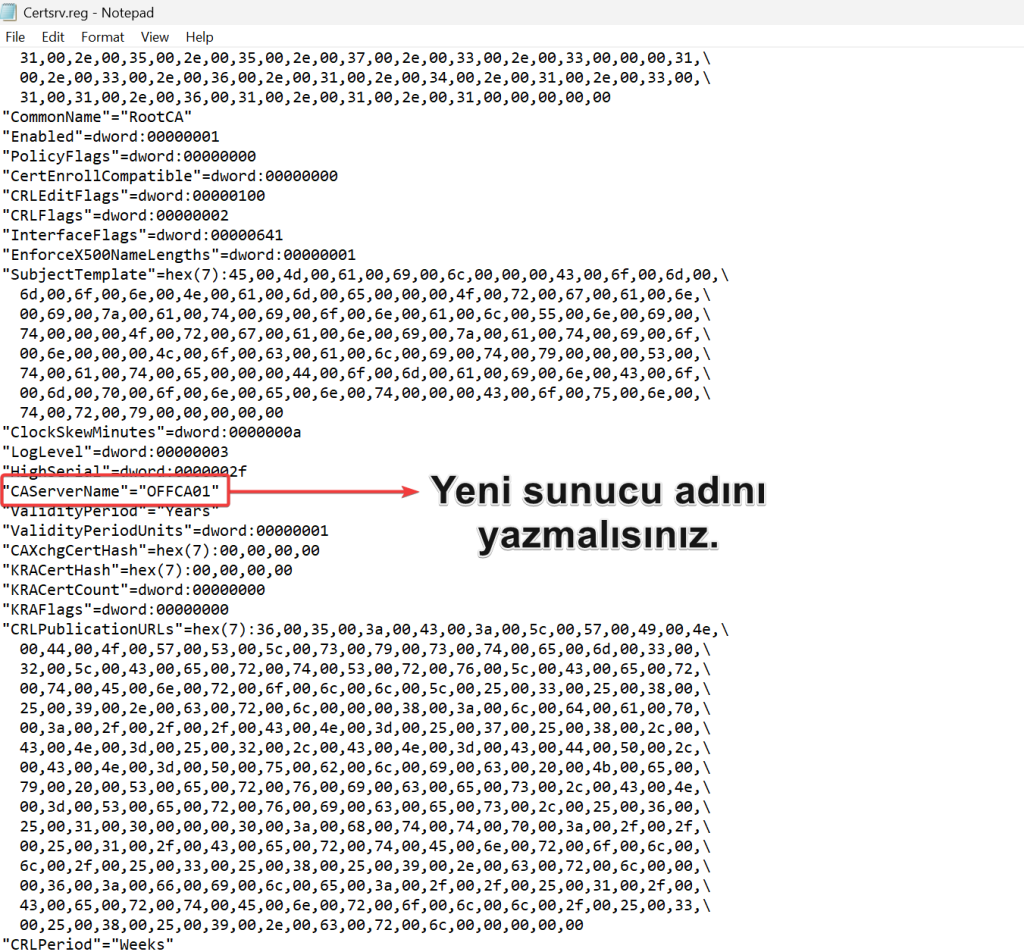 * Sunucunuzu farklı bir isim ile kurmak istediğiniz taktirde eski sunucudan aldığınız regedit export dosyasını notepad ile açarak “CAServerName” değerini yeni atadığınız sunucu adı ile değiştirdikten sonra kaydederek, regedit dosyasını import etmelisiniz.